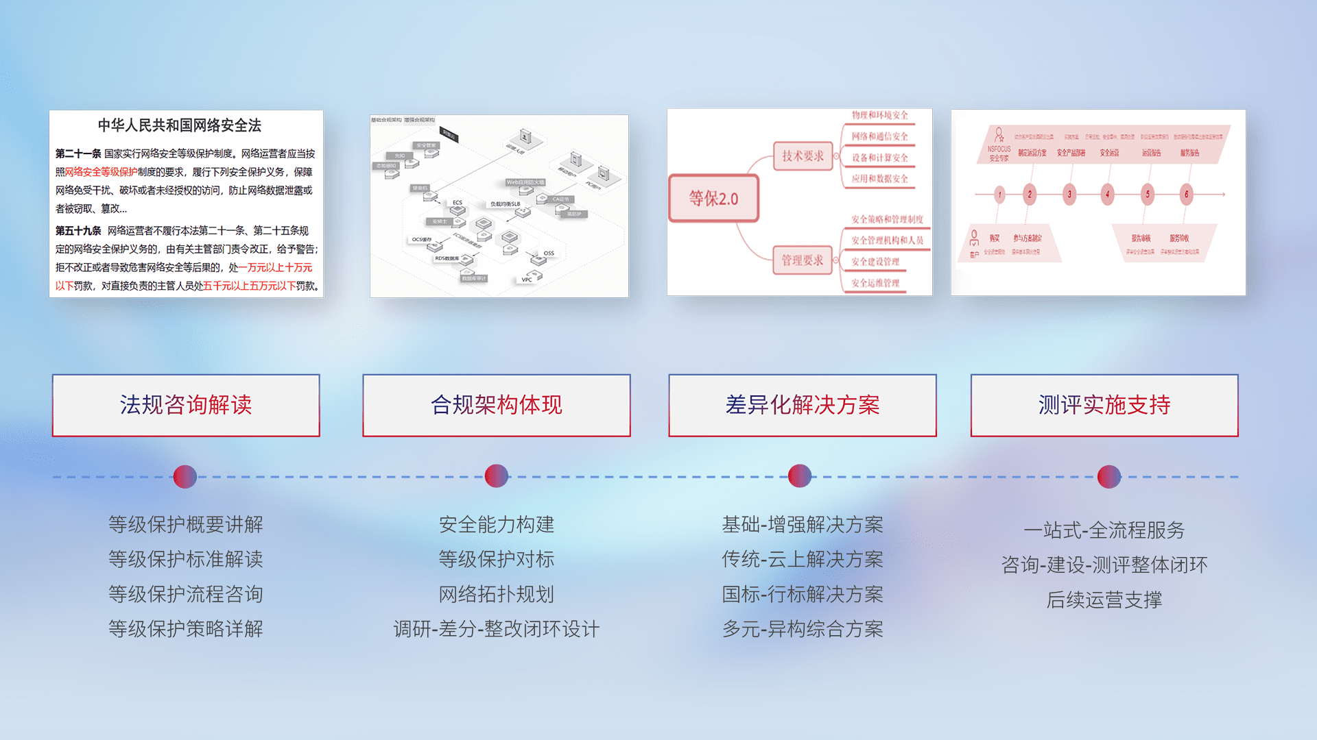 通过专业的法律咨询解读、、合规架构体现、、差异化解决方案、、、测试实施支持等服务,,,为客户量身打造等保合规体系。。。。